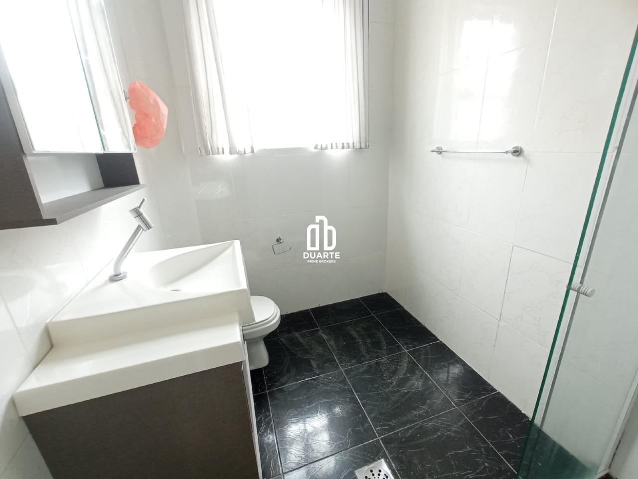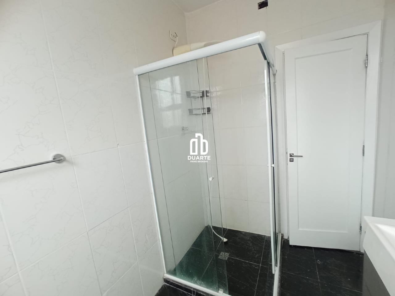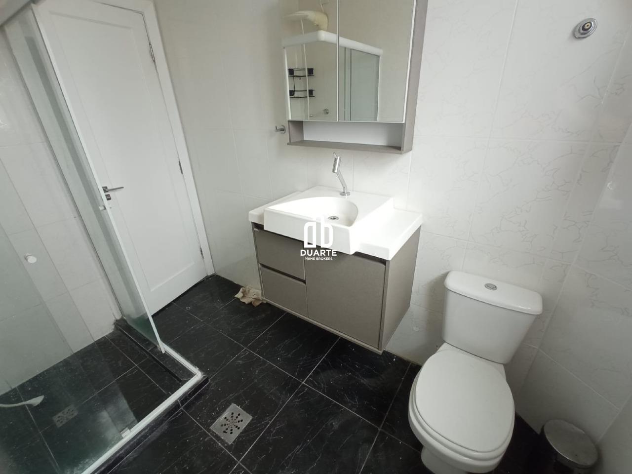 Banheiro social com armário e box de vidro temperado