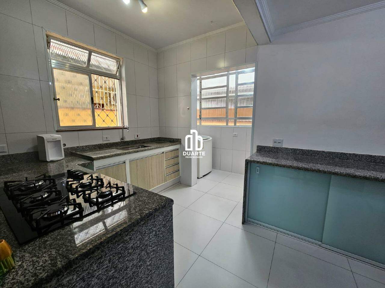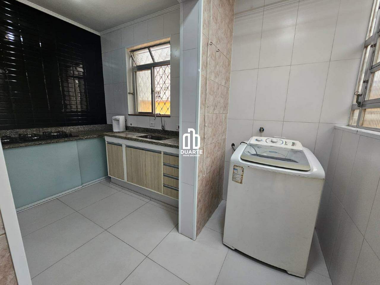 A cozinha conta com uma bancada ampla integrada à pia e um balcão de apoio, oferecendo praticidade no dia a dia. Na área de serviço há máquina de lavar e um banheiro adicional, além de uma despensa externa com acesso pelo quintal.