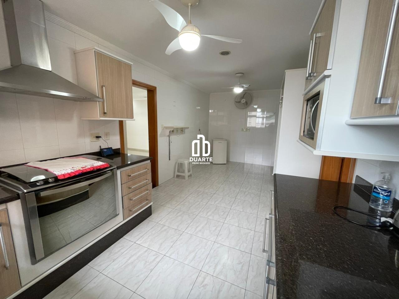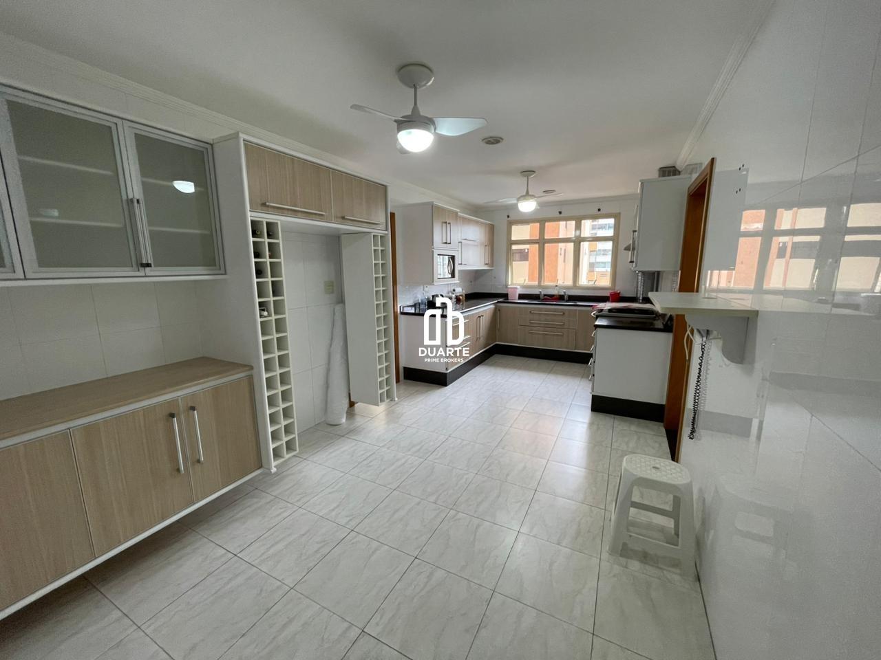 A cozinha é ampla, funcional e equipada com armários planejados e ventiladores de teto.